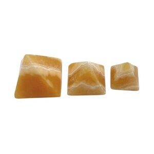 Polished tan onyx pyramids offer aesthetic appeal and promote a calming atmosphere. Versatile for decor or spiritual practices.