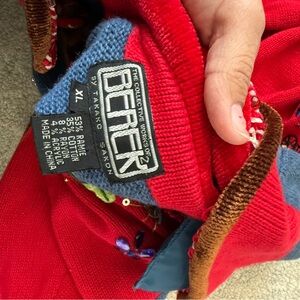 Vintage Vibrant red cardigan featuring western-themed embroidery. Accented with brown and blue details. Perfect for adding a unique touch to your outfit. Berek • Size XL • Western • Red • Beaded • Embroidery • Sweater • Horse/ Hat/ Cactus/ Stars/ Wagon