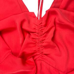 The fit-and-flare silhouette flatters the figure, while the 3/4 flared sleeves add a touch of whimsy. Perfect for weddings, formal occasions, or a sophisticated night out, this dress features a flattering V-neckline that complements the empire waist, ensuring a polished and poised look. The solid pink hue allows for versatile styling, and the adjustable neckline offers a personalized fit. With its ruffle accents and A-line style, this dress combines classic elegance and modern flair, making it timeless. You can see where the tag was taken off in photo 10. Measures a 50" Chest and is about 44" long.