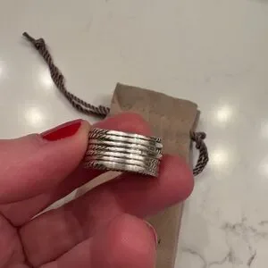 Like new! Very comfortable to wear. Ready for something new. This elegant silver ring features a unique twisted band design, perfect for adding a touch of sophistication to any outfit. The intricate detailing and classic silver color make it a versatile accessory for any occasion.