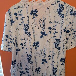Womens Blue and White floral blouse with lace trim around neckline and down center front.
