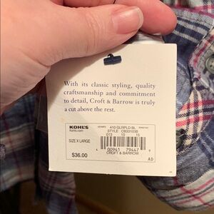 NWT Croft & Barrow Stylish plaid button-up shirt in blue and pink. Features long sleeves and front pockets. Size XL 100% cotton