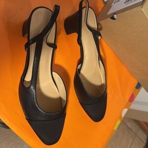 Step out in style with these elegant black slingback heels with a textured toe cap. 2.75 inch chunky, heel and padded insole. Perfect for any occasion, these shoes offer both comfort and sophistication. New without tags. Size 10. NA441.