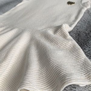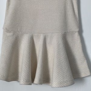 Cream colored dress with gold threading throughout. Could also be worn as a tunic with leggings underneath. There is a small area on inside hem where the stitching has come loose (see pic). If you have that color thread, it is an easy fix. Cannot tell when dress is worn! Otherwise, the dress is in perfect, clean condition! Adorable! 😍