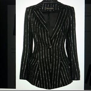 Stunning black blazer by designer Christian Siriano. Features metallic silver pinstripes for a bold statement look. Tailored fit with long sleeves, single-breasted front, and sleek lining. Perfect for evening wear, formal occasions, or power dressing.