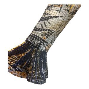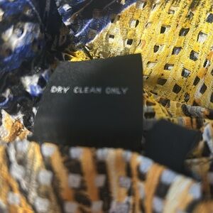 Three season, warm weather item. Dress is a semi-lightweight fabric that I hesitate to call mesh; the close up photo of the back and the photos of the tags show the fabric well; while not exactly eyelet, it has some eyelet-like qualities. Dress is lined in white that peeks through the square holes in the fabric; sleeves are unlined. Double breasted, with inside hold-closed button; the dress itself snaps closed to a few inches above the hemline. Ruffle-front shawl collar. Padded shoulders. Dual layered bell at the edge of long sleeves. A-line silhouette. Abstract floral print in navy and blue, white, gray, with shades of yellow and off-gold. If this was my size, you would not be reading this listing. It's gorgeous, much nicer in person than it is in photos!