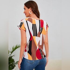 Details: Stylish geometric print top featuring vibrant colors. Perfect for a chic and modern look.