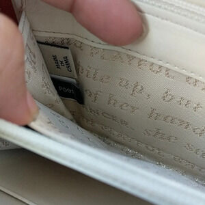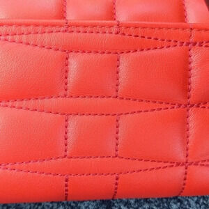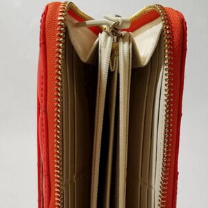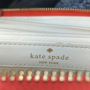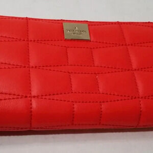 This Kate Spade wallet features a lipstick red color, gold hardware, a quilted stitch look, a middle pocket, and zip around closure.