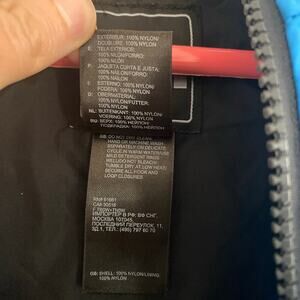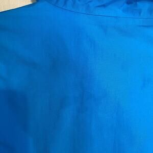 Jacket does have a spot on the back which is not very noticeable and not visible when the hood is down. There are also a couple small spots underneath the arm which are also not very noticeable. See last two photos for these. Otherwise in excellent condition. Has armpit vents and zipper pockets, adjustable Velcro cuffs