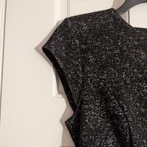 This sophisticated sheath dress features a striking black and white design, perfect for a wedding guest or cocktail event. The peplum detail at the waist adds a touch of elegance, while the high-low hemline offers a modern twist. With a crew neck and cap sleeves, this midi dress combines classic style with contemporary flair.