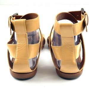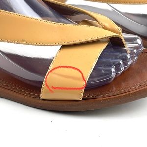 Bottega Veneta Beige Leather V Strap Flat Sandals. Boho Style Sandals. This sandal is designed with an eye-catching V-strap with an adjustable buckle. This sandal has slight discoloration on the outside part of the right sandal. Please see the last 2 pictures. You can barely notice it. Signed of wear on the sole area.