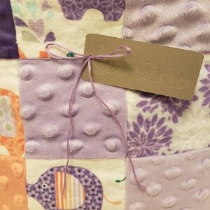 This handmade blanket measures approximately 39"x51". Made with patchworked snuggle flannel and minky fleece squares, backed with minky fleece. Machine wash cold, gentle cycle, tumble dry low.