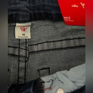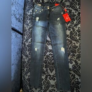 Very cool True Religion girls Halle jeans. Stretch denim for ultimate comfort. Mid rise/ super skinny fit. Strategically placed tears for that well loved look. Lots of branding details. Adjustable waistband for customized fit.