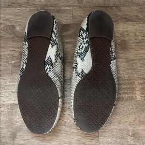 Step out in style with these Tory Burch ballet flats. Featuring a chic snakeskin pattern in black and cream, these shoes offer both elegance and comfort. Perfect for any occasion.