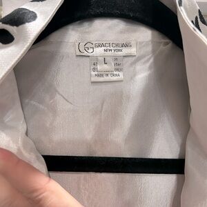 The brand is the fabulous Grace Chuang of New York, the size is large, has interesting black designs, fabric is firm but comfortable, loose fit, mandarin collar, great condition. This unique piece adds a fun flare to any formal outfit. A modern twist on an oriental staple.