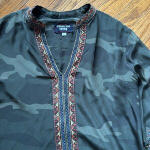JOHNNY WAS Laila Paris Embroidered Effortless Silk Camo Blouse Top Size Small