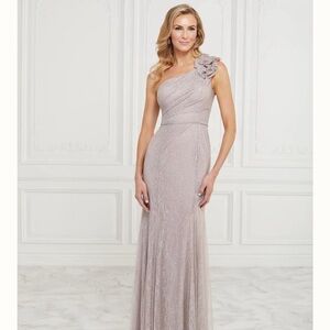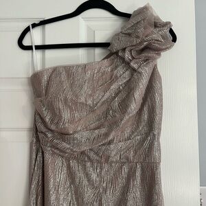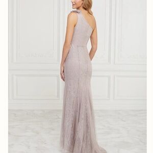 Elegant taupe and silver dress by Christina Wu Celebration. Perfect for special occasions. Worn once to my daughter’s wedding. I am 5’9” it was not altered except to add a bustle for the very small “train” on the back. Has a blush tone in the light. Last pic is actual photo from wedding. Beautiful dress, flows when you walk - love this dress!
