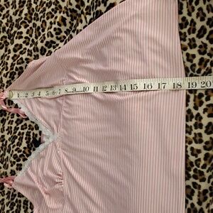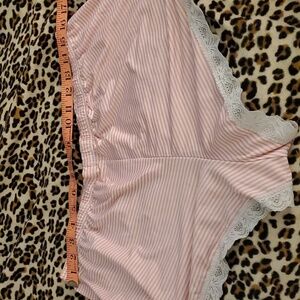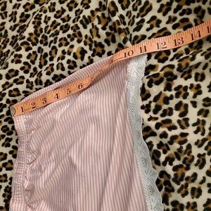 cute pink and white striped lounge wear set. tank top and booty shorts with lace trim.