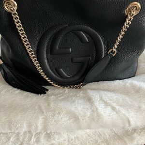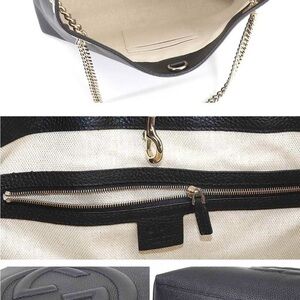Elegant Gucci black leather bag featuring a gold chain. Perfect for any occasion.
