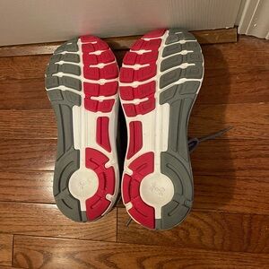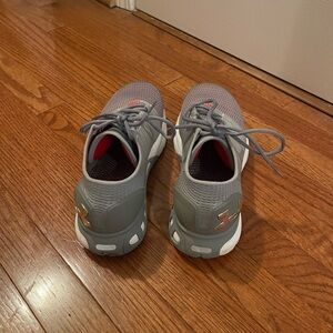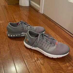 Under Armour athletic shoes in gray with pink accents. Ideal for running and sports.
