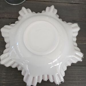So classy, elegant and nostalgic! A beautiful bowl for display/decor. Pink on the inside and white on the outside with clear glass at the very edge of the ruffled edge. 11" across and 3.5" deep
