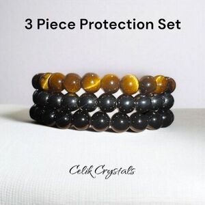 3 Piece Protection Bracelet Set Tiger Eye Hematite Black Tourmaline 8mm Unisex