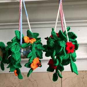 Handmade/crochet mini hanging plants. NOT made in China, I made them ! I have 10 plants available, 2 mini strawberries, 8 plants with flowers. 100% acrylic. Each plant about 6”-7” long( strands not included); pots approximately 2”x2,5”. Colors: 1 -white;