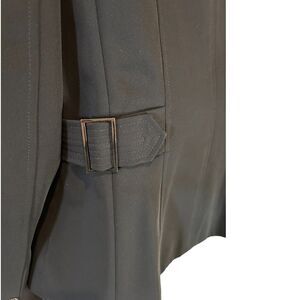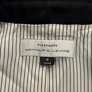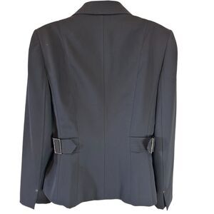 Elevate your professional wardrobe with this sophisticated black blazer from Tahari Arthur S. Levine. Features a tailored fit with flattering princess seams, notched lapels, and three silver-tone buttons. Side buckle detail adds a unique touch. Fully lined with striped fabric. Perfect for business meetings, interviews, or formal occasions. Can be dressed up with matching trousers for a power suit look or paired with jeans for smart casual style. Excellent for year-round wear and versatile styling.