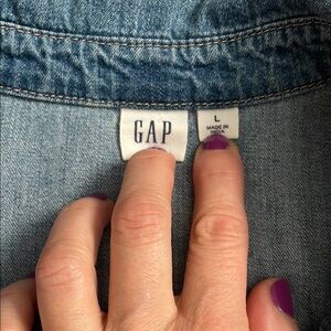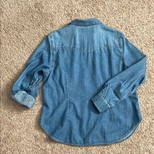 Stylish blue denim shirt with snap-up front and chest pockets. Perfect for casual wear. Size Large. Only worn once or twice. From smoke-free home.