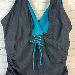 Dive into style with this chic teal and black halter swimsuit. Perfect for a day at the beach or poolside lounging. Size 3X (22/24)