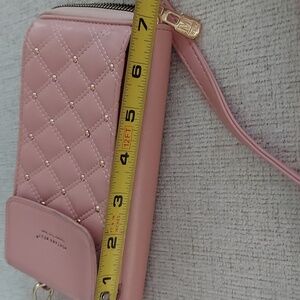 Adorable and versatile shoulder wallet/purse with RFID protection. Outer pocket for phone pluses ample space for cash, ID, cards inside the zippered pockets. Quilted style vegan leather in pink with gold-toned studs. Fully adjustable, removable strap takes thos from crossbody to shoulder to wristlet to clutch in a breeze!