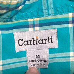 This Carhartt shirt features a vibrant green and yellow plaid pattern, perfect for a laid-back, casual look. Made from lightweight cotton, it's ideal for warm-weather wear. The button-down collar adds a touch of classic style to this comfortable and versatile shirt. Preowned very good condition Size M
