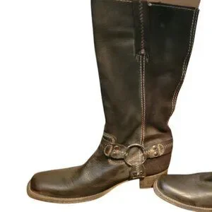 Bed Stu Opal boots, known for their weathered finish, harness detailing, square toe and a 13-inch tall shaft