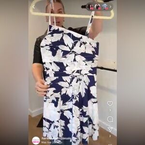Elegant dress with a blue and white floral pattern. Features a stylish design with thin straps.