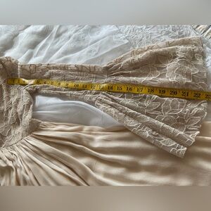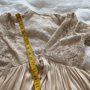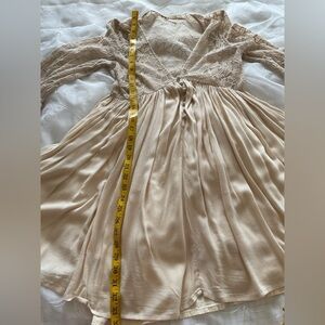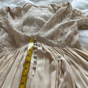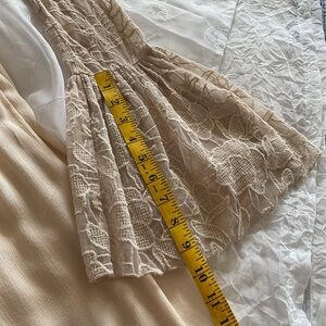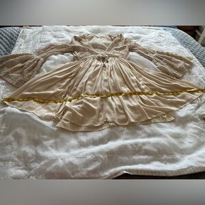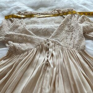 Free People Women’s Small Beige Bell Sleeve Mini Dress. V-Neck Top 1/4 Button Down Sleeve and Top Floral Lace. Skirt is Mini to Knee Length with Beautiful Flare. Has Elastic in Sleeve. Tank Under Lining