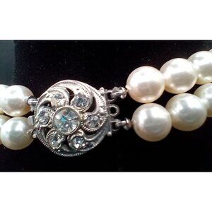 This vintage double strand faux pearl choker necklace has a classic 14-inch length with a rhinestone box clasp. Perfect for adding a touch of 50s elegance to any outfit, it's a timeless accessory for special occasions or everyday wear.