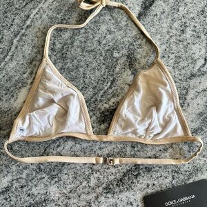 Stylish Dolce & Gabbana bikini. Features a shimmering gold color. Triangle top with adjustable ties. Bottoms with button details.