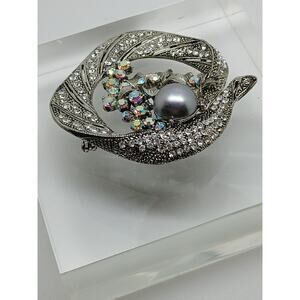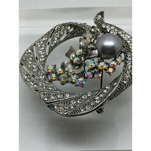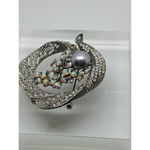 Gorgeous Vintage Estate Silver Grey Pearl Rhinestone Crystal AB Brooch