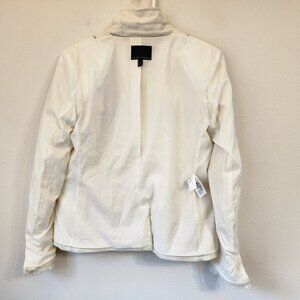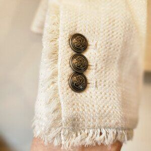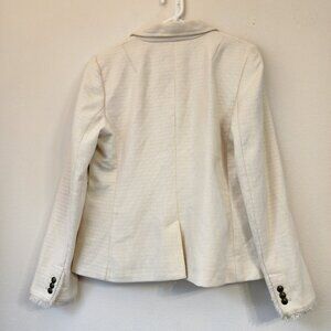 Banana Republic Ivory White Tweed Blazer with Fringe Brass Button Sz 14 Academia