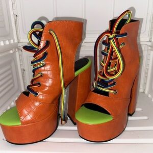 Step out in style with these vibrant orange platform heels. Featuring a bold design with colorful laces, these shoes are perfect for making a statement. Ideal for adding a pop of color to any outfit.