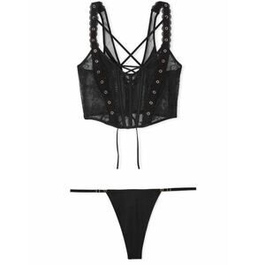 Victoria's Secret Very Sexy Rose Lace Grommet Strappy Corset + Dream Angels Smooth Adjustable Thong Panty both Black - top is size Medium DD & bottom size M and new.