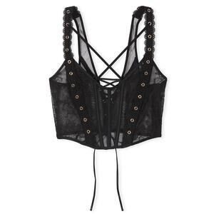 Metal grommets, strappy accents, and a classic corset tie-up detail add daring definition to this sheer lace style. Designed with boning to add structure and define your curves.