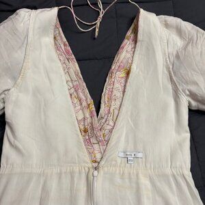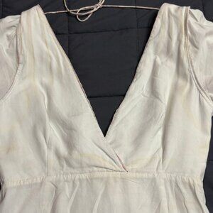 This is a pre-owned, RTR dress. This dress had the string tie in the back broken off at the connection to the dress. I had it professional fixed. Also there are stains on the inside upper lining front & back. It looks like someone either wore body makeup or tanner and it has lightly rubbed off on the white lining. I think this might be treatable, but regardless, there is no sign of theses stains from the outside. Other than these 2 issues, the dress is in very good pre-owned condition. Please see the closeup pictures. This is the cutest little dress and if I was 25 years younger and still a size 8, it wouldn't be for sale!! :-)