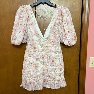 Topped with voluminous puff sleeves and finished with ruching and ruffles, this Sau Lee mini dress brings the romantic drama from head to hemline.