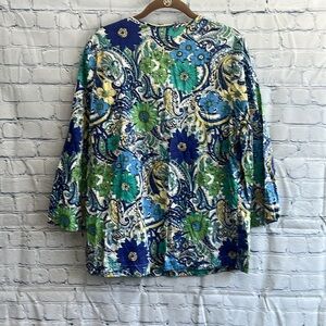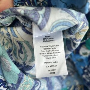 This Talbots blouse is a colorful floral patterned top made of 98% cotton. It features a V-neck and long sleeves, with a pullover closure. The blouse is lightweight and breathable, suitable for all seasons. It is designed in a regular fit for women's size medium, perfect for various occasions like travel, parties, work, or casual wear.