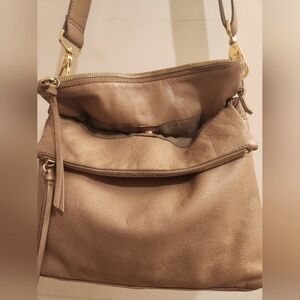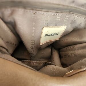 This elegant tan leather shoulder bag by Margot is perfect for any occasion. Its versatile design complements any outfit. 2 small blemishes as shown in photos 3 and 7. Large pocket on both sides of bag. Zippers and snap closure at top of