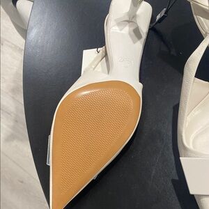 These Zara slingback heels in a crisp white color feature a pointed toe and a comfortable kitten heel, perfect for adding a touch of elegance to any outfit. The adjustable slingback strap ensures a secure fit, while the subtle texture of the fabric adds a refined visual interest.