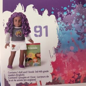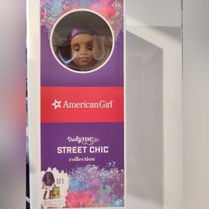 Street Chic Collection. This stylish kids doll features a vibrant purple outfit with white accents, perfect for imaginative play. She has brown skin and curly purple hair.