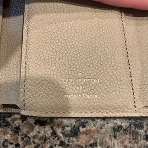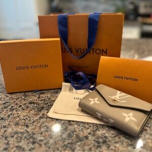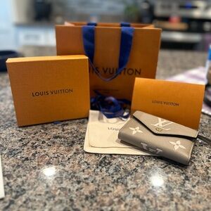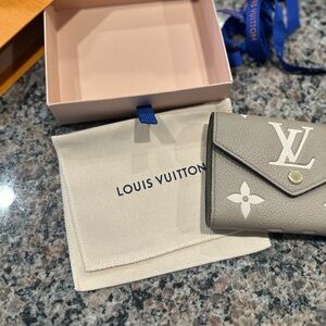 Elegant Louis Vuitton wallet in a sophisticated dove and cream color wave. Perfect size small wallet that can fit everything you need! Wallet is basically new and in near perfect condition other than it being lightly used! Comes with the dust bag, box, shopping bag, everything you would get if buying in store! Less than 6 months old!! Smoke free pet free home no flaws on the wallet! Best wallet I’ve ever had just need money more than the wallet!!
