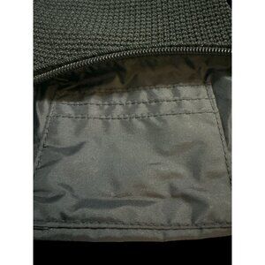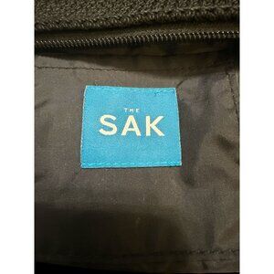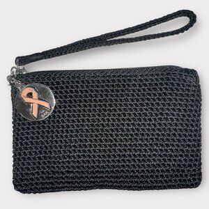 Stylish black crochet wristlet by The Sak, perfect for organizing essentials. Features a charm with pink ribbon insert, honoring Breast Cancer Awareness. Ideal for carrying cards and small items.
